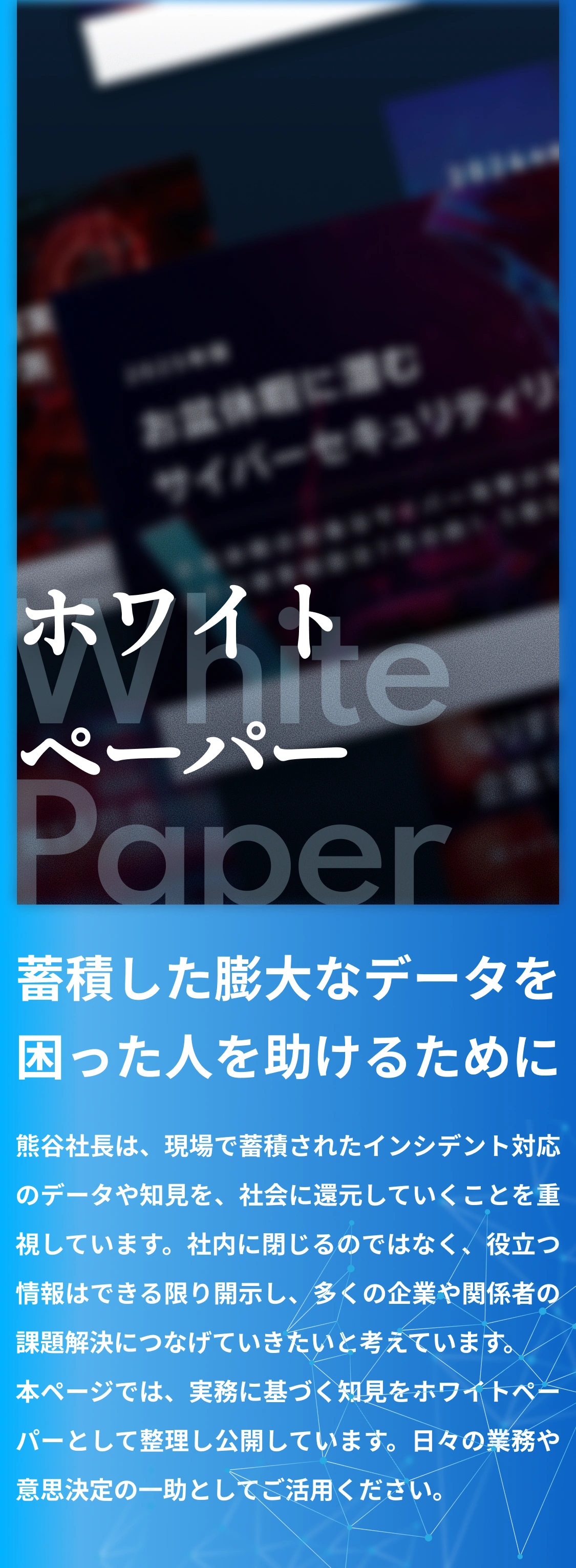 熊谷社長は、現場で蓄積されたインシデント対応のデータや知見を、社会に還元していくことを重視しています。社内に閉じるのではなく、役立つ情報はできる限り開示し、多くの企業や関係者の課題解決につなげていきたいと考えています。 本ページでは、実務に基づく知見をホワイトペーパーとして整理し公開しています。日々の業務や意思決定の一助としてご活用ください。
